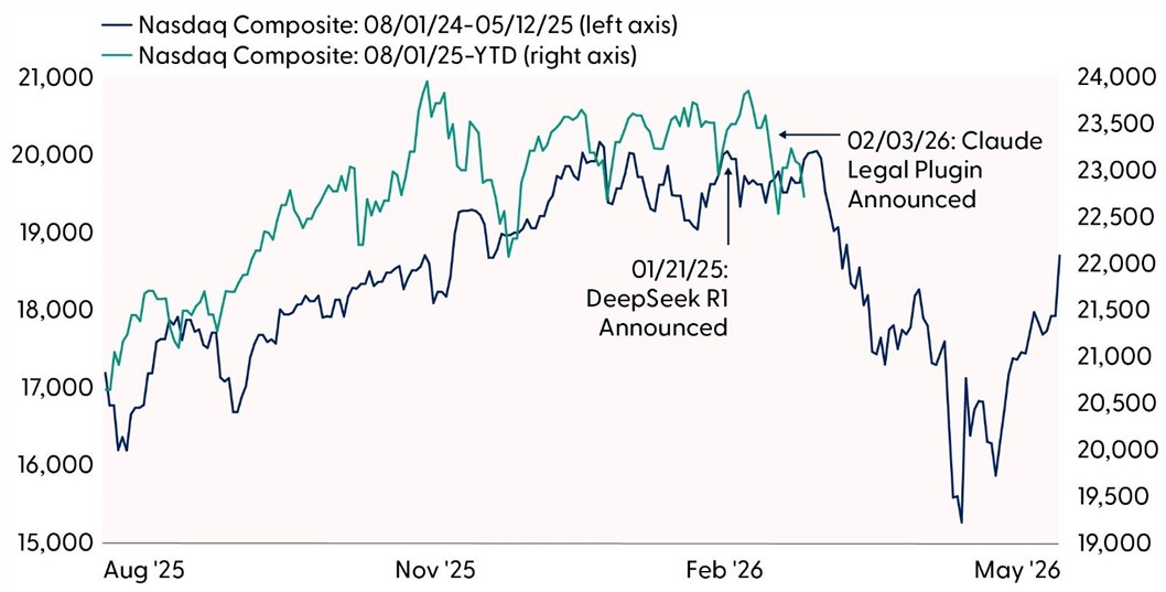 While today’s AI‑driven market turbulence echoes aspects of the DeepSeek episode, recent price action also mirrors last year’s setup in the Nasdaq Composite, where overbought conditions and fatigue in AI‑related enthusiasm set the stage for heightened volatility. DeepSeek’s announcement at the time added fuel to that backdrop, contributing to steep drawdowns — such as NVIDIA’s more than 20% decline in only a few weeks. But unlike last year, new tariff announcements extended the volatility into April, even as the longer‑term secular AI trend remained firmly intact.