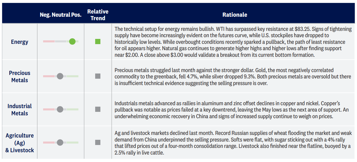 Metals declined in September after being dragged down by weakness in gold and silver. Both precious metals suffered sizable technical damage after they broke below support from their summer lows. Oversold conditions have developed, raising the odds for a potential relief rally on a near-term horizon; however, there is limited technical evidence pointing toward any imminent capitulation. Industrials metals advanced, although copper failed at an important downtrend. An underwhelming economic recovery in China and signs of increased supply continue to weigh on copper prices. We maintain our neutral view on both the industrial and precious metals group.