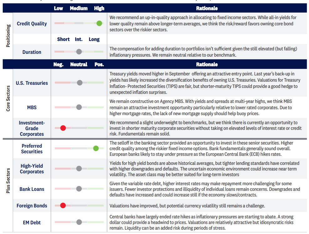 Longer-maturity Treasuries were higher in September as the market continues to reprice expectations for the Fed’s policy path, pricing out some of the anticipated rate cuts throughout 2024 while also shifting the expected “neutral” rate higher. Yields on high quality fixed income sectors moved higher as well, offering investors another opportunity to take advantage of attractive valuations. Importantly, starting yields are the best predictor of long-term returns and with starting yields at levels last seen over a decade ago, the return prospects for fixed income have improved as well. That said, aside from preferred securities, valuations for riskier fixed income sectors remain rich relative to core sectors, in our view.