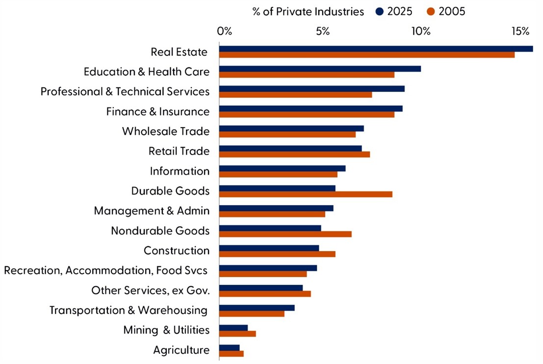 Over the past economic cycle, the composition of the U.S. economy has continued its long‑running shift toward services, with the FIRE industries — finance, insurance, and real estate — forming the largest share of value added. FIRE accounts for more than one‑fifth of U.S. GDP, making it the single largest broad sector in the economy, a trend reinforced by consumers’ increasing preference for services over goods. As the population ages, demand for healthcare services has also grown sharply, pushing healthcare and social assistance into a more prominent role in economic growth. These demographic shifts cement services — particularly FIRE and healthcare — as central pillars of economic activity, shaping both labor demand and investment patterns.